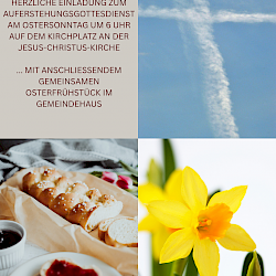 Auch in diesem Jahr laden wir wieder herzlich ein zu einem Auferstehungsgottesdienst mit dem CVJM-Posaunenchor um 6 Uhr auf dem Kirchplatz an der Jesus-Christus-Kirche. Wir öffnen die Türen d...