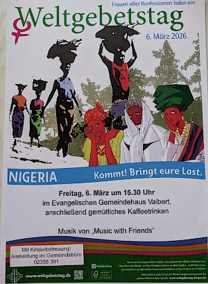 Gebete, Musik und Texte wurden in diesem Jahr von Frauen aus Nigeria zum Thema "Kommt! Bringt Eure Last! zusammengestellt. Gehört werden Hoffnungen und Sorgen der nigerianischen Frauen. Sie möchten sich und uns motivieren, mutig und hoffnungsvoll zu glauben, auch in schwierigen Lebenslagen.